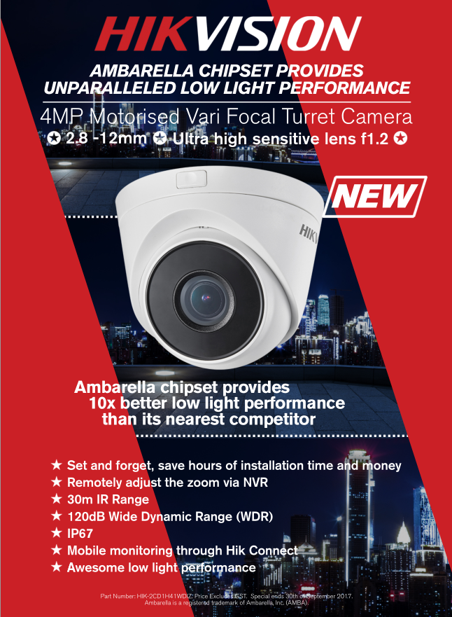 Hikvision has released an exciting new 4MP motorised varifocal turret camera. With an impressive feature set, this stylish turret camera incorporates the new Ambarella* chipset which provides up to 10x better low light performance than its nearest competitor.