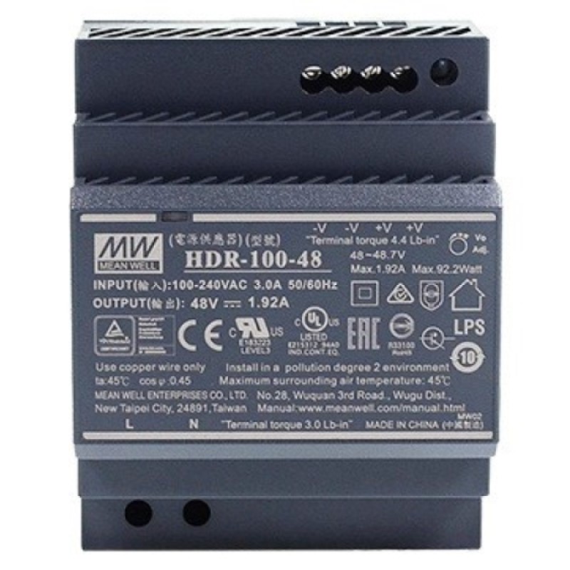 The 2N-03479-001 is an external power supply for the 2N Clip 2wire-IP (03450-001), DIN-rail mountable, IN: 100-240V AC/3A, OUT: 48V DC/1.92A, rated power 92.2W.