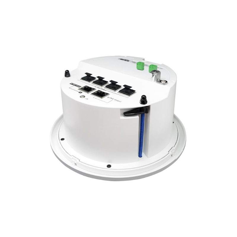 The AET-C42-05030B is a ceiling PoE switch with one PoE bt input port, five PoE outport ports and visible LED indicators for simplified in ceiling installation of POE and DC power devices. The AET-C42-05030B daisy-chain PoE feature extends long range PoE up to 300m over cat 5e/cat 6 cable without extra AC/DC power adapter in ceiling.