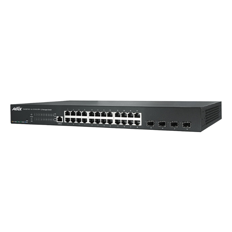 The C60-244-30-370X from Aetek is a L2 PRO gigabit PoE managed switch, equipped with 24-port 10/100/1000M RJ45 with IEEE 802.3af/at PoE PSE function and 1/10G SFP+ slot for flexible linking when environments will connect to 1G fibre uplink or upgrade to 10G fibre link.