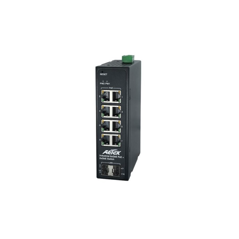 The AET-D40-082-30 is a Gigabit PoE solution for the Industrial environment and offers eight of 10/100/1000BASE-T ports featuring 30-watt 802.3at. Further empowering the units are 2 additional Gigabit copper ports and another 2 extra SFP fibre slots for uplink.