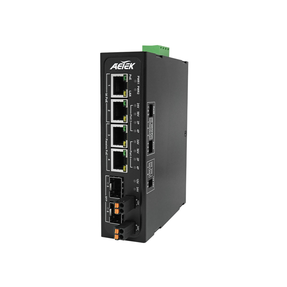 It enables indoor connections of PoE PDs to the network such as outdoor IP cameras, wireless APs, and other industrial applications. The D32-042-91 provides 2-port gigabit bt PoE with 2 port gigabit adjustable 24VDC or 56VDC passive PoE as well as additional 2-port GbE SFP transceiver slots for flexible uplink. It also provides 12VDC/24VDC output for non-PoE devices.