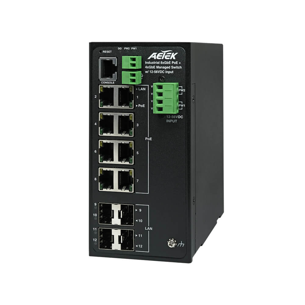 The AET-D60-08430DC is an Aetek industrial L2 PRO Gigabit 30W PoE Switch with 12-56VDC input.