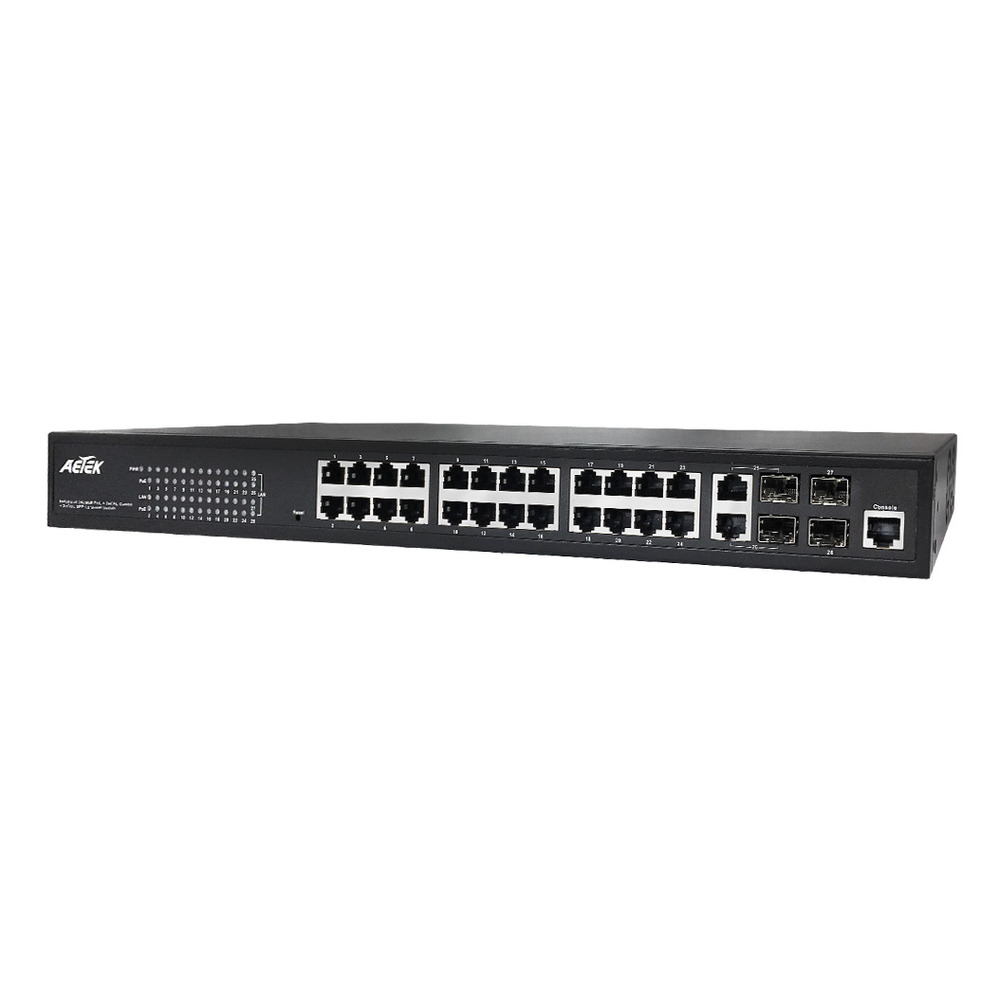 The Aetek D60-244-30 offers a broad range of industrial L2 PRO gigabit PoE switches, with 24x gigabit PoE (10M/100M/1G) ports, 2x gigabit combo RJ45/SFP ports and 2x gigabit SFP ports for flexible linking. This switch complies with IEEE 802.3af/at standards, with sufficient PoE power budget for any application.