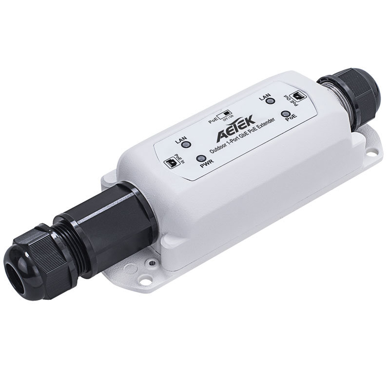The Aetek E69 series is IP67-rated and a hardened PoE Extender. Operating at temperatures from negative 40 degrees to 65 degrees celsius, it's ideal for harsh outdoor environments. No power adaptor is required, being powered by PoE Injector, middle-span hub, or PoE switch.