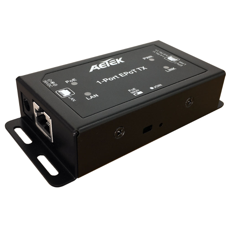 The Aetek AET-TE10-110-TX, a 1-to-1 EPoT (ethernet and power over UTP/STP cable (Cat5/Cat6) transmitter (TX) equipped with 1 EPoT port and 1 RJ-45 PoE port and is designed to connect a remote PoE IP camera over single UTP/STP Cat.5e/6 cable without requiring an extra power supply. This cutting-edge model delivers data and power at long range up to 1,200m for a PoE IP camera.