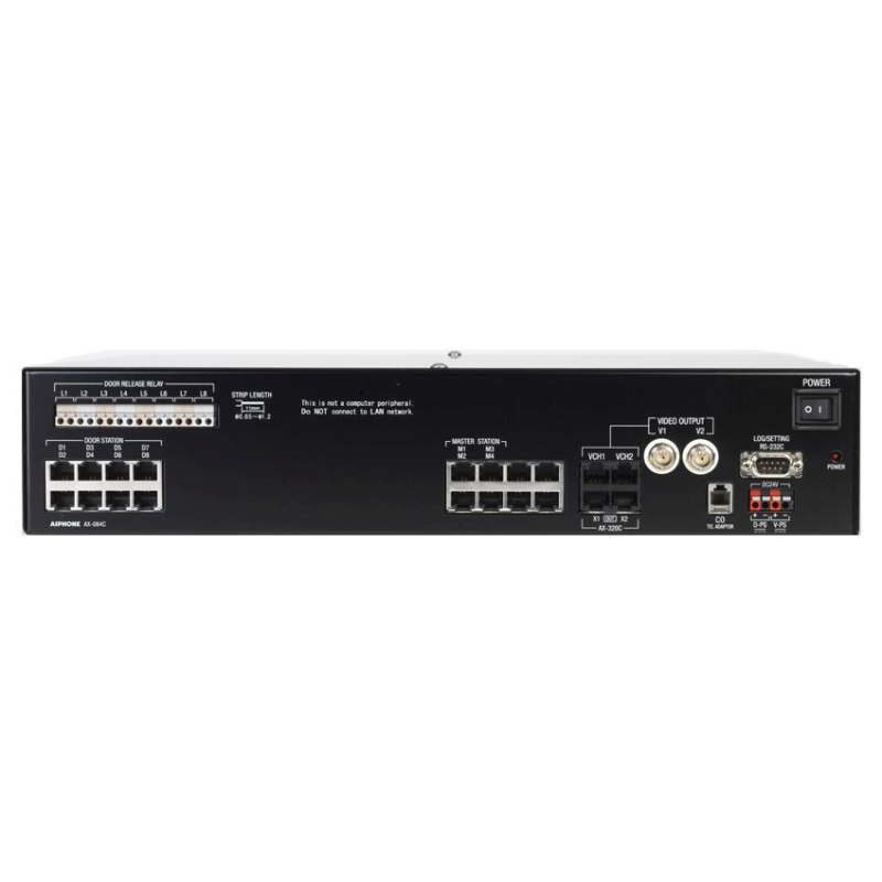 The AI-AX-084C is the "brains" of the AX Series. It allows the connection of up to 4 masters and 8 door stations. The AX-084C has an output for video, an *RS-232 connection for CCTV and Access Control interface and PC programmed dry contacts for remote control functions.