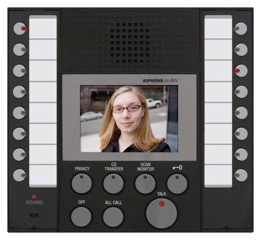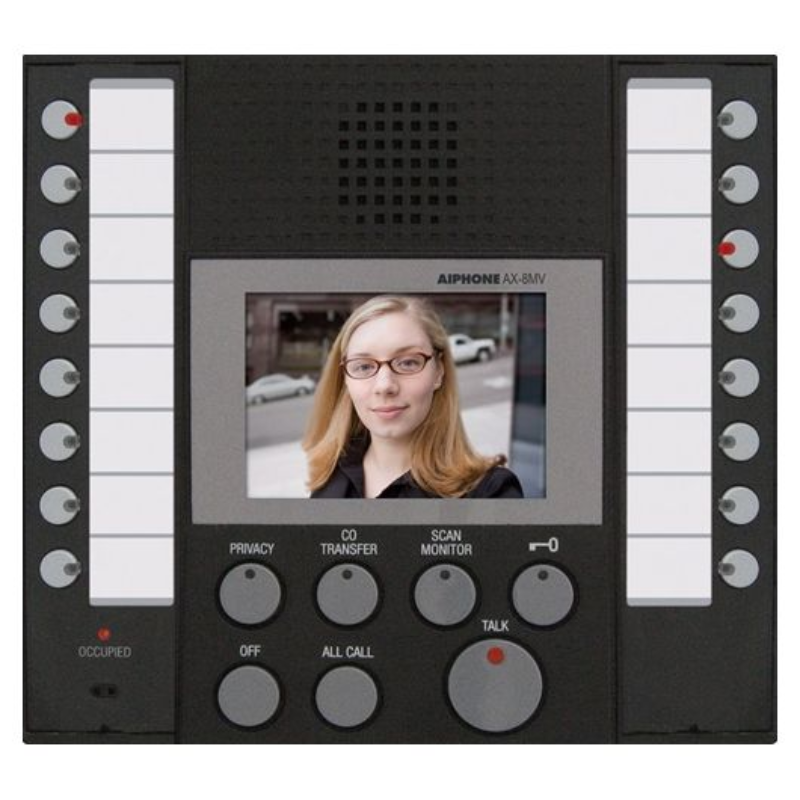 The AI-AX-8MV is an audio video master station for the AX Series. The unit is CAT5e homerun wired to it's CEU and features a 3 -1/2" TFT monitor, an oversized TALK button to activate the VOX or PTT style communication, door call-in indicator, call button for other master stations in the system, a call tone volume control and a button for door release. The AX-8MV can communicate to 8 masters and 8 door stations. Add-on selectors (AI-AX-16SW) can be added to increase the number of doors to maximum 120.