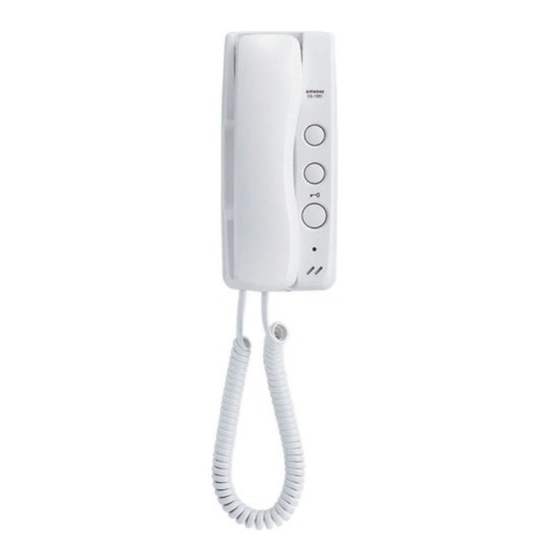 The AI-DA-1MD master handset features a call tone volume control, handset for communication and button for door release. It connects via two wires to a DA series door station.