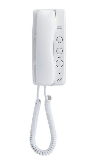 The AI-DA-1MD master handset features a call tone volume control, handset for communication and button for door release. It connects via two wires to a DA series door station.