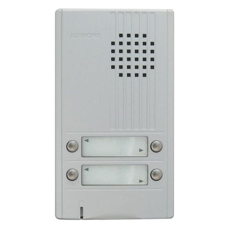 The AI-DA-4DS is a silver door station that connects via two wires to the AI-DA-1MD or AI-DB-1MD masters. The AI-DA-4DS features a 12V AC output for door strike connection, selective call buttons and illuminated directories. Pressing a call button on the AI-DA-4DS rings a specific AI-DA-1MD or AI-DB-1MD master. Communication at the AI-DA-4DS is hands free.