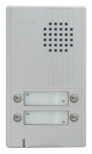 The AI-DA-4DS is a silver door station that connects via two wires to the AI-DA-1MD or AI-DB-1MD masters. The AI-DA-4DS features a 12V AC output for door strike connection, selective call buttons and illuminated directories. Pressing a call button on the AI-DA-4DS rings a specific AI-DA-1MD or AI-DB-1MD master. Communication at the AI-DA-4DS is hands free.