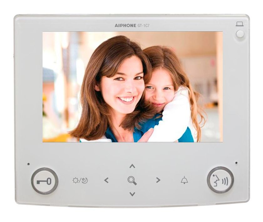 When a visitor calls, the tenant station rings and video is displayed on the screen. The call is answered by pushing the talk button. The AI-GT-1C7 has the capability of calling the concierge/security guard station(s), turning on an external light while speaking with a visitor at the entrance, and receiving an emergency tone from a pull cord or panic call button. The AI-GT-1C7 has a slim, streamlined design and can be surface mounted. Only one AI-GT-1C7 video station can be used per tenant.
