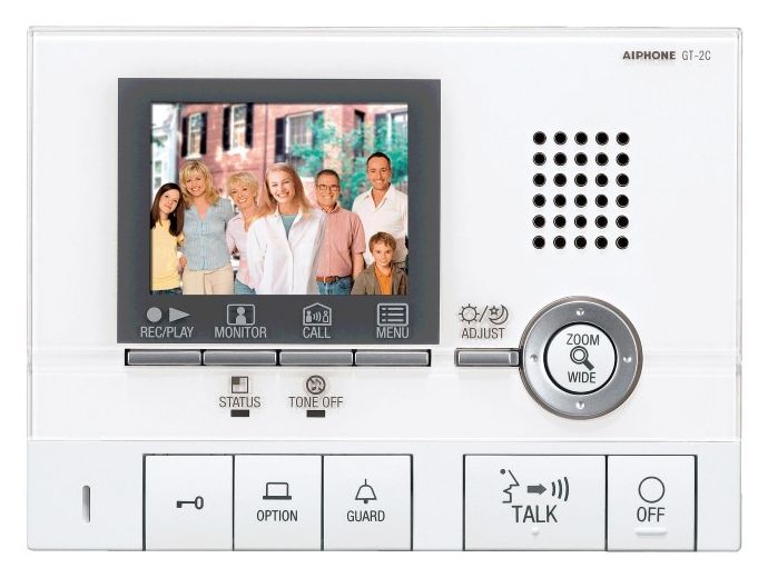 Suite security connects up to 4 alarm or utility sensors to the GT-2C. When activated, the siren sounds whilst alerting doorman/security stations of trouble. GT-2C allows for internal communication to talk between GT-2H sub stations (up to 3 subs). The GT-2C also provides picture memory, 170 degree pan, tilt and zoom camera control, and an optional handset.
