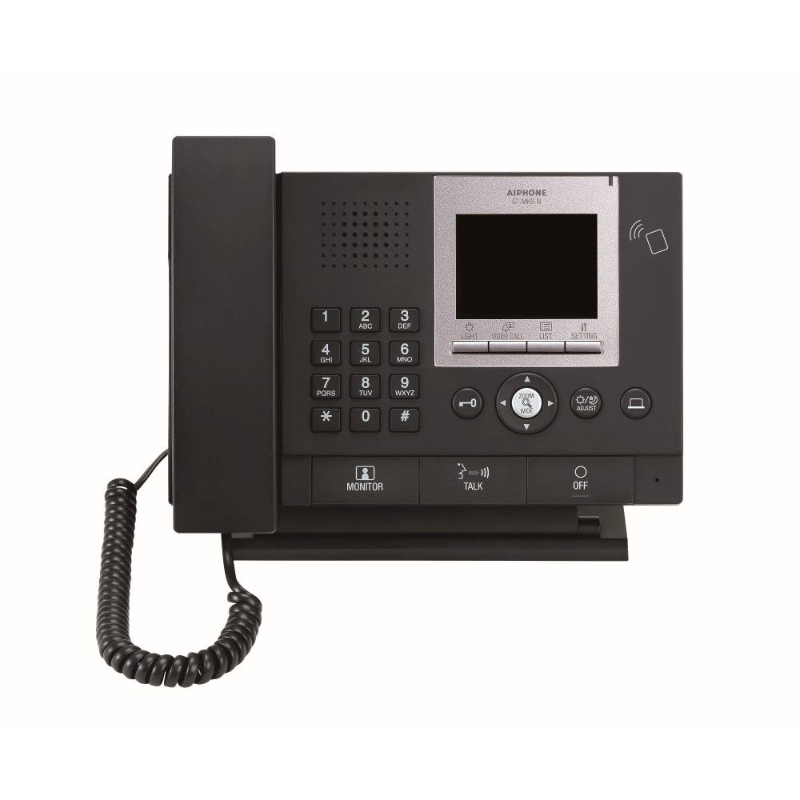 The AI-GT-MKB-N is a video guard station with NFC programming technology. It is equipped with up and down buttons to search for names via tenant directory, and a door release button to unlock entrance where call was initiated. There is a handset for private communication and a keypad for dialing both tenant and entrance stations. Surface mount to wall or a 3-gang electrical box, or may be desk mounted using included desk stand.