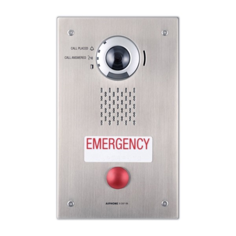 The Aiphone AI-IX-DVF-RA is a flush mount, weather resistant (IP65) and IP addressable video call station. This station has a single emergency call button and a placard with raised lettering and Braille signage. The call button can call up to 20 different stations. The AI-IX-DVF-RA is also equipped with a 1.23MP fixed colour camera and can connect to a network using Cat-5e/6 cable.