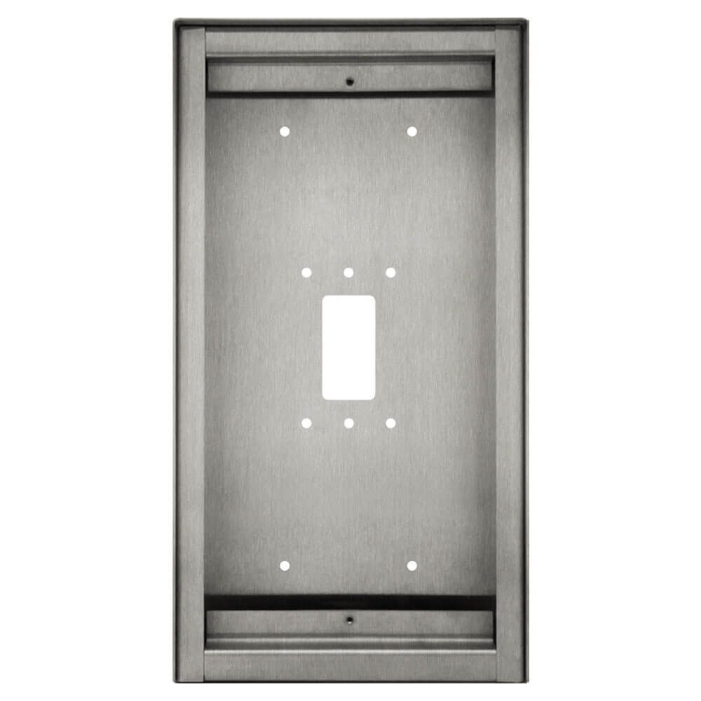 The AI-SBX-IXGDM7 is a surface mounting box used for mounting IXG-DM7-HID, IX-DVF-4A and IX-DVF-6. The box has a 1-gang and 2-gang mounting hole pattern in the back and 1 conduit knockout in bottom.