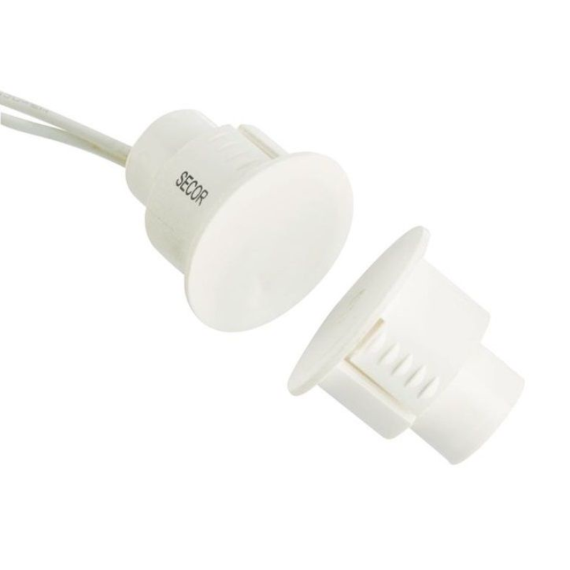 Magnetic reed switches use no glue or screws to mount. Small protrusions hold the contact in place. Use indoors or outdoors for an attractive recessed installation.