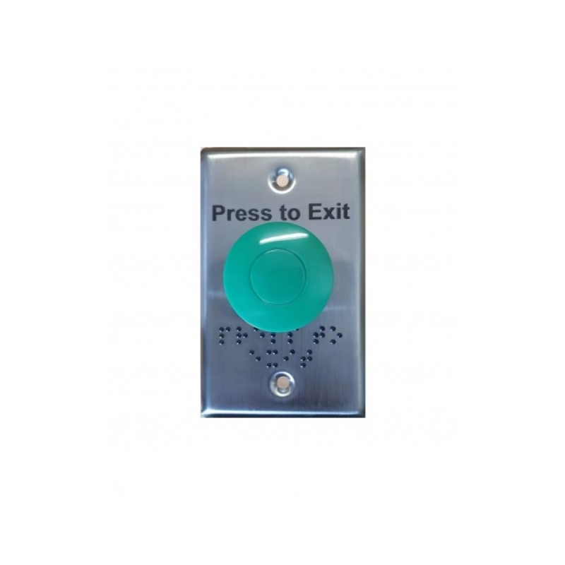 Mechanical push to exit green mushroom button with isolated NO and NC contacts, mounted on a stainless steel plate. Press to Exit in braille writing.