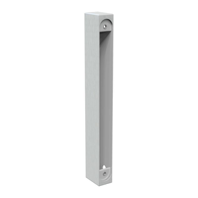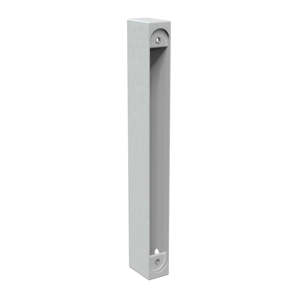 Dormakaba's DK-DBA145J housing is a fixture that the DK-DBA143E strike plate sits into and is secured for surface mounting, typically used for glass door installations.