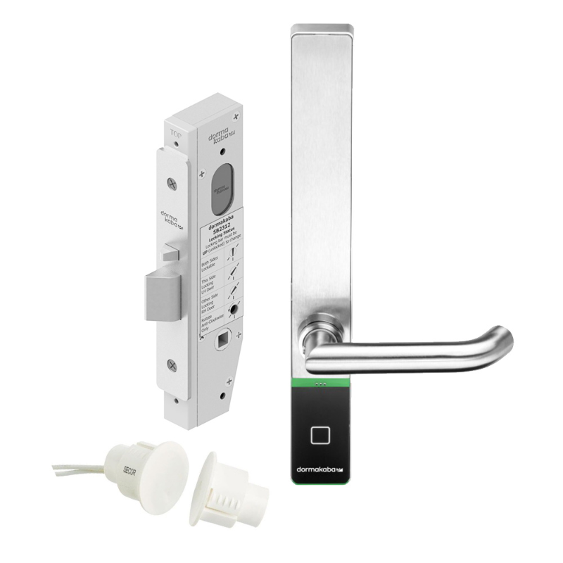 The DK-PROM-KIT-30-KO kit includes Dormakaba's C-Lever Pro wireless lock and the SB2312 mortice lock and one CSD-2002 reed switch. Dormakaba use a standard cylinder cut out hole to allow the use of existing cylinders when retrofitting existing sites.
