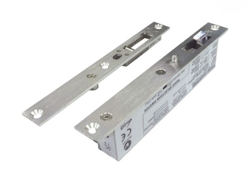 The FSH HL1260 is a high torque motor driven hook lock for a sliding door. It can be installed vertically in the door frame (lock style) with the strike plate mounted on the edge of the door.