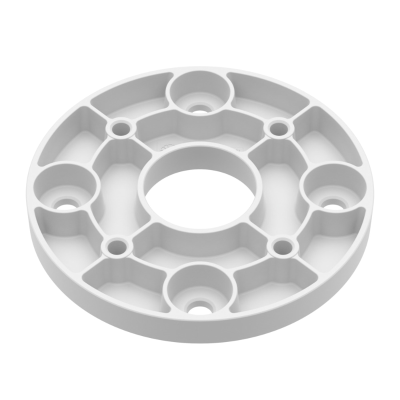 The HAN-SBP-004PBW Hanwha mounting converter is a white adaptor plate that lets ruggedised PTZ cameras mount with a 4.75" bolt pattern while providing a universal 4" PCD interface with TR30 screw size. It is compatible with Hanwha PTZ models such as the TNP-A6550RW, TNP-A7430RW and TNP-A9430RW.