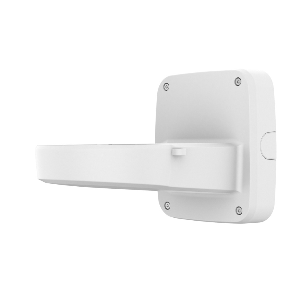The HAN-SBP-004WMW is a rugged white wall and pole mount bracket designed for heavy duty outdoor PTZ installations. It has a TR30 mount, supports up to 15 kg load, reversible upright/canted/inverted installation and fits Hanwha ruggedised PTZ cameras such as the TNP-A6550RW, TNP-A7430RW and TNP-A9430RW.