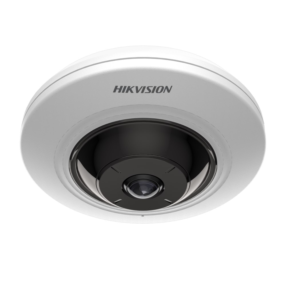 The Hikvision HIK-2CD2955G0ISU is a 5MP fixed fisheye network camera offering a 180-degree panoramic field of view, H.265+ compression, and 120dB true WDR for strong back-light performance.