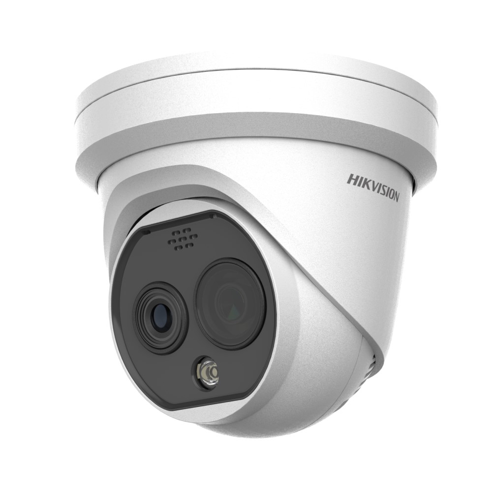 The HIK-2TD1228T-2QA is a bi-spectrum thermography turret camera from Hikvision's HeatPro Series. It combines a 256 x 192 thermal imaging module with a 4MP optical camera, enabling fire-prevention temperature alarms, smoke detection, and AI-based human/vehicle classification.