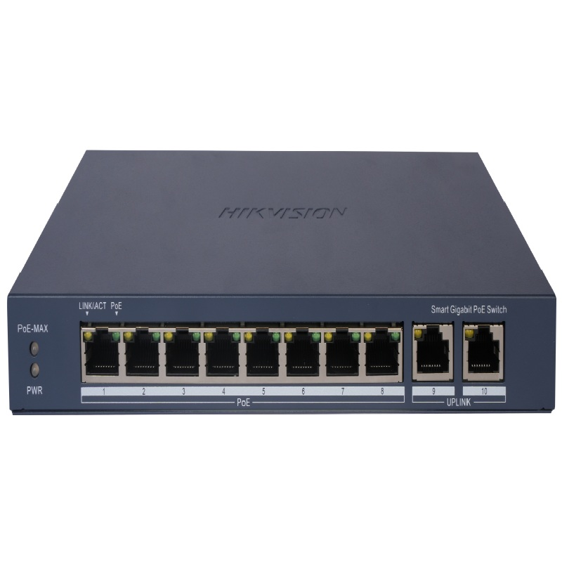 The Hikvision HIK-3E1510P-EI is a smart 8-port Gigabit PoE switch designed for professional surveillance networks with advanced management features.