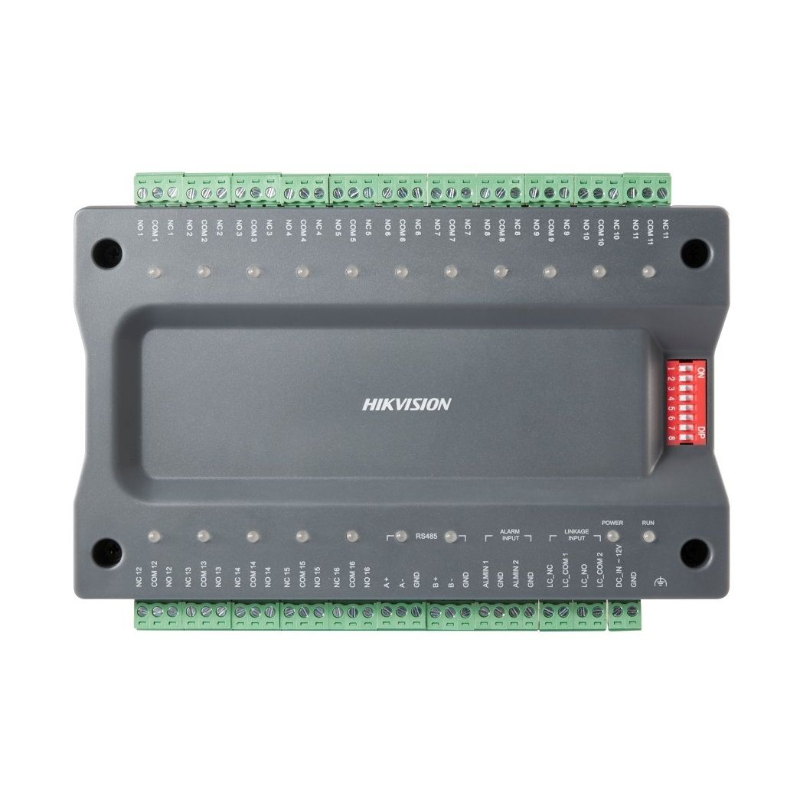 The Hikvision HIK-K2M0016A is a distributed lift controller which connects to the HIK-K2210 master lift controller via RS-485. A maximum of 8 distributors can be connected to a master lift controller. Each distributor has 16 floor relays offering a system capacity of 128 floors.