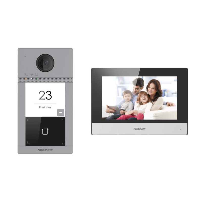 The Hikvision HIK-KIS604-P is a one-to-one IP villa bundle from the 2nd generation range. This bundle is made up of one villa door station and one 7 inch room station, both enabled with Wi-Fi. It is suited to applications where a robust solution is required, as the door station is IK09 rated. It also includes the required power supplies, simplifying the ordering process and ensuring a smooth setup.