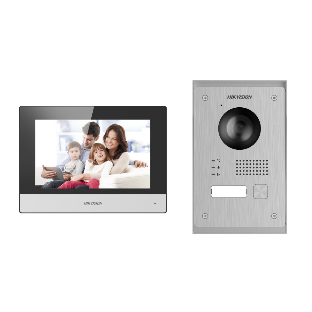The Hikvision HID-KIS703Y-P 2 wire intercom bundle features a single button door station and a 7" screen room station. This is great for upgrades as the connection between these stations is a basic 2 wire cable run and the room station's WiFi connectivity also allow it to call the Hik-Connect app. Power to the sysem only requires the provided PSU to be connected to the room station, which also powers the door station. The system cannot be expended to add extra door or room stations, keeping it simple.