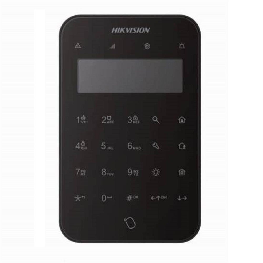 The Hikvision HIK-PK1-LT-WB-BK is a wireless LCD keypad that is part of the AX PRO Wireless Intrusion Alarm system. It operates on a 433MHz two-way wireless communication. The device features an LCD screen and LED to indicate system status. System configuration can be done through the LCD screen.