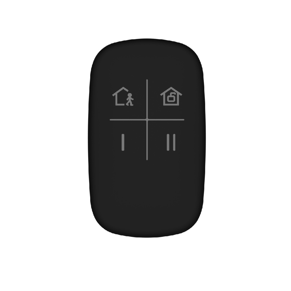 The HiLook HIL-ALARM-PKF1WB is the black-coloured version of Hikvision's AX PRO wireless key fob, used for quick arming/disarming of AX PRO intrusion alarm systems.