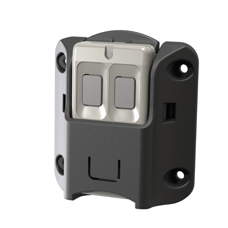 The INO-EN1233H is a holster that allows the Inovonics 1233 & 1236D duress buttons to be securely mounted to the underside of a desk, table, or wall. The holster allows for the button to be removed for mobile operations or battery replacement.