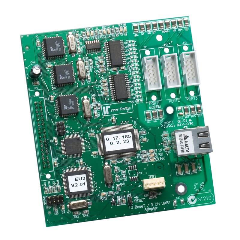 Plugging directly onto the Control Module, Ethernet UART boards provide up to three high-speed, software configurable serial ports to allow interaction with third party building automation systems and connection of peripheral serial devices to the Concept 4000 Control Module. The Ethernet UART provides a 10BaseT Ethernet connection between the Concept 4000 Control Module and Insight software in addition to up to three serial ports. This allows communication over LAN, WAN, VPN and the internet. Up to four simultaneous connections can be maintained via the UART board - an operator using Insight can be communicating with a Control Module whilst the Control Module is interfacing with building automation systems, high level lift interfaces, Multipath STUs, printers or GSM units.