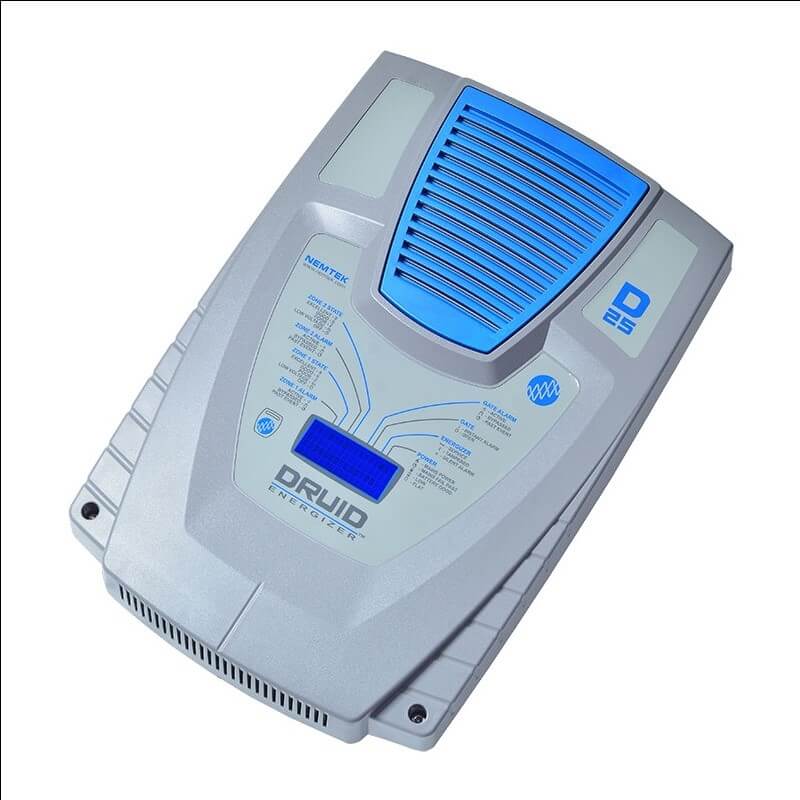 The Nemtek NEM-E-DRUID25LCD is an LCD dual zone energizer. The LCD display in the Druid range makes information on the status and performance of the energizer quick and easy to read. Using the Adaptive Power Technology (APT) pioneered by Nemtek, these energizers offer a unique technology to detect how much power a fence can accept and handle before it starts to arc and waste energy. This maximises the power on the fence and minimises false alarms. Synchronisation between energizers can be achieved by using traditional network cabling or by the Druid synchronisation modules which use orbiting satellites and eliminate the need for cabling between the energizers.