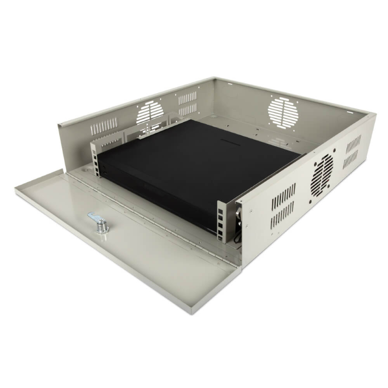 The PA-SMCAB-M is a mid-size lockable NVR enclosure with 1 fan. It has a powder coated steel construction, mounting holes to mount the unit securely by its base and is vented on 3 sides for improved airflow. Included you will find 2 x 30CFM fans, fan power supply, thermo switch to regulate the fan operation and tamper switch for added safety.