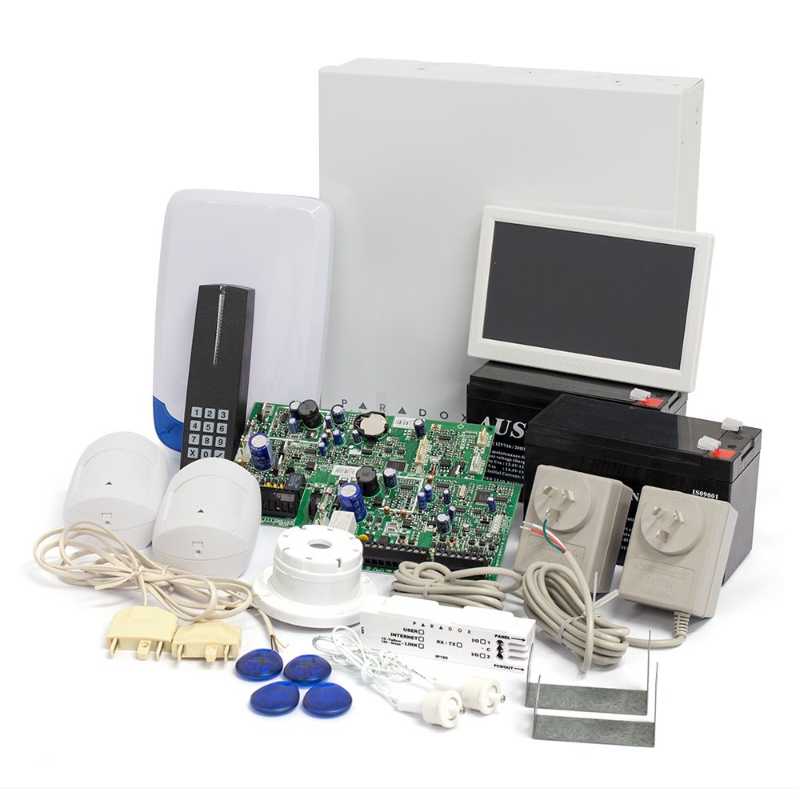 The Paradox EVO192, Insite Gold IP ready hardwired package, including two DG65 quad digital detectors, internal / external sirens and a TM70 seven inch touch screen. This package also includes an ACM12 access control module with an R915 card / pin code reader and four proximity tags.