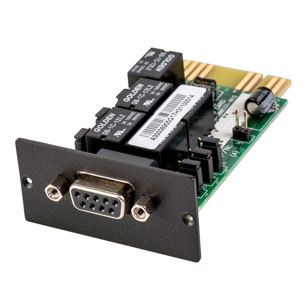 The PSH-PSAS400D provides VFC (volt free contact) relays that change state upon UPS events. This type of card is often used when current loop communications are required for devices such as BMS (building management systems), access control, alarm panels, or industrial PLCs.