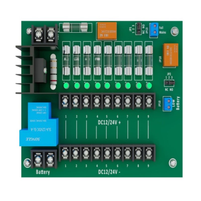 The PSS-ZP-DC9PCB is a DC power distribution board PCB with battery charger, 9 way output.