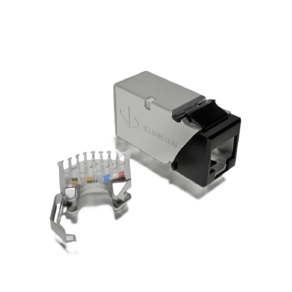 The Siemon SIE-Z6ASK01B is a Z-MAX Category 6A shielded RJ45 keystone outlet, designed for high-performance 10GBASE-T networks. It features Siemon's compact Z-MAX 45 degree shielded design, allowing easier cable exit in shallow back boxes while maintaining proper bend radius. This outlet exceeds all Category 6A performance requirements, including alien crosstalk, and is supplied in black.